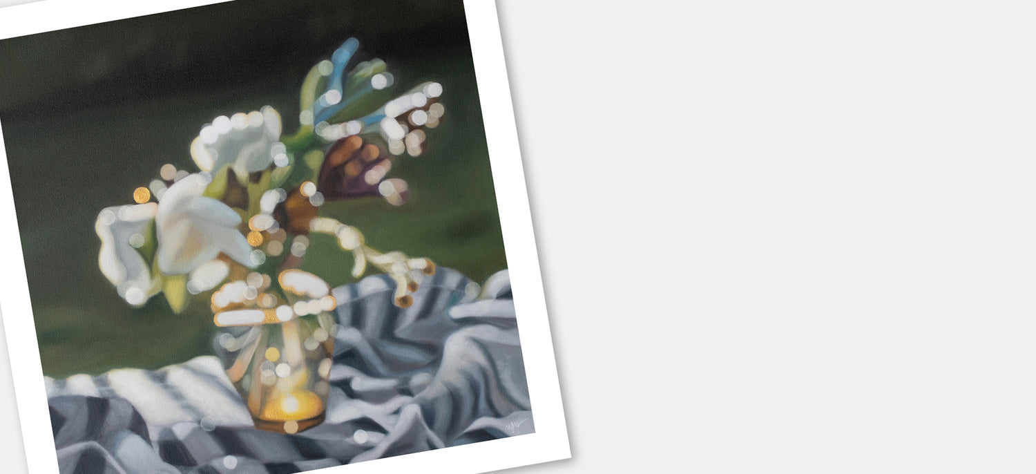 These paintings are designed to be emotional insulation for your home. In contrast to the hardness and noise of the world, the work gently holds your focus on light, beauty, and the good.