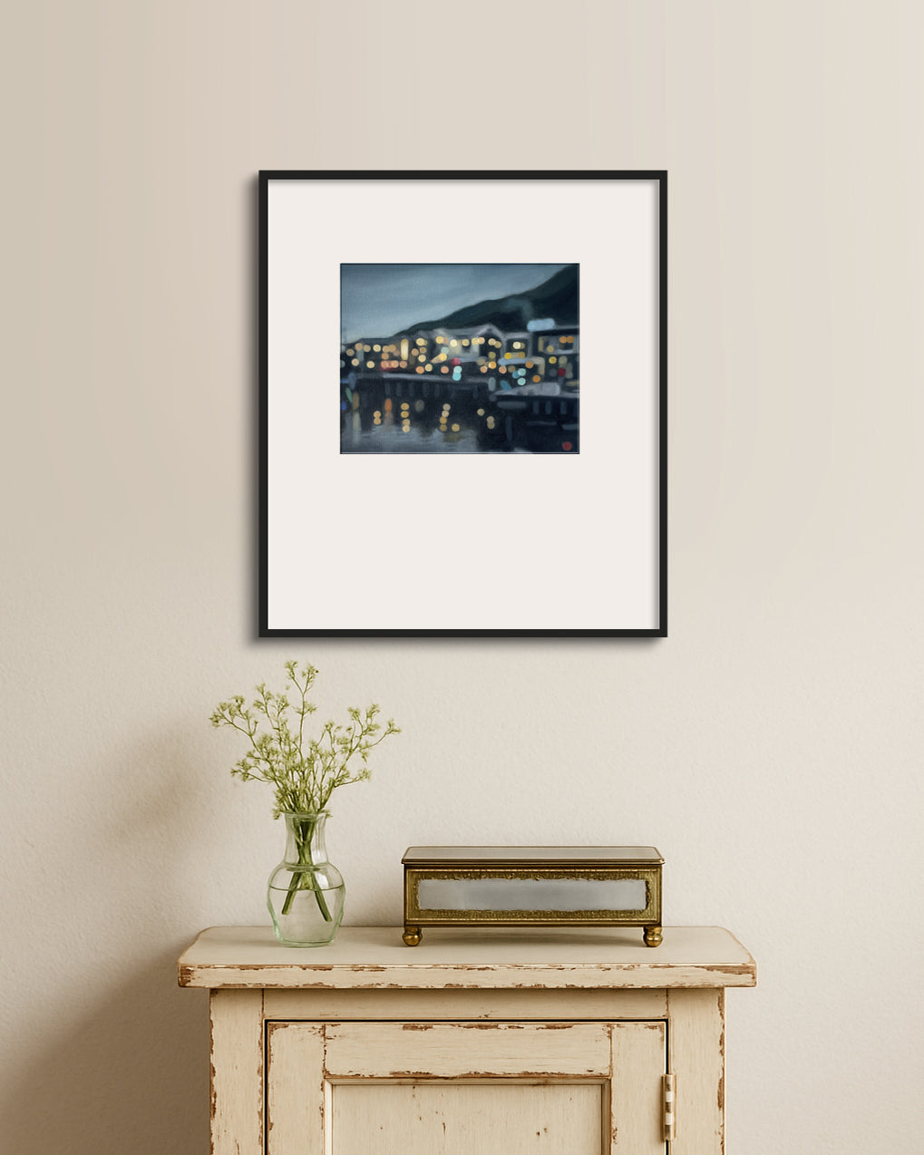 Warm lights spilling from Steamer Whar are reflected and doubled in Lake Wakatipu below. The hills rise dark and protective behind, while the wharf itself becomes a threshold between the lit world above and its shimmering echo in the lake.