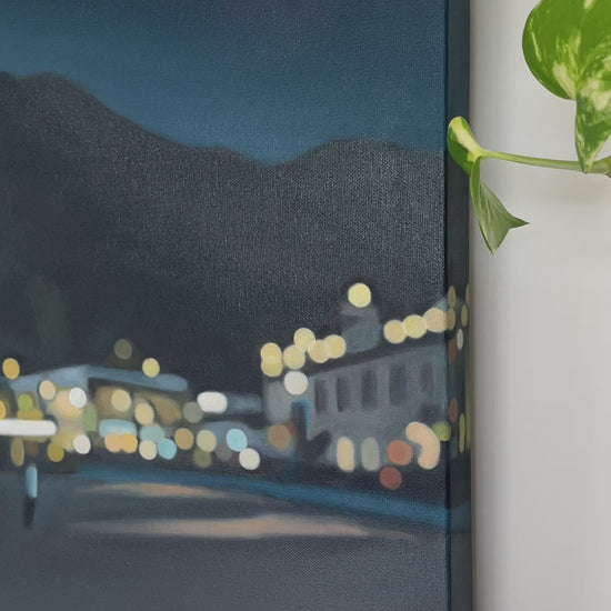 This panoramic original oil painting captures Queenstown’s waterfront at the tipping point, when day becomes night. From the beach, the view stretches along the lake taking in the lights of retail and hospitality, including Steamer Wharf, and extends up the length of the lake.